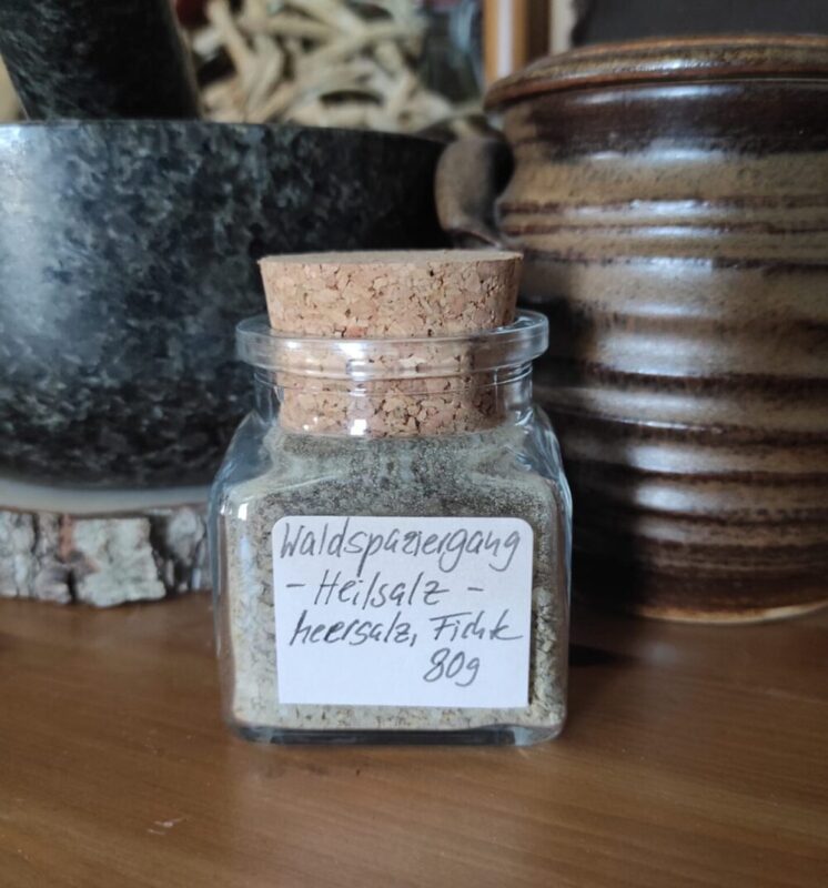 Das Kraftsalz Waldspaziergang enthält Fichtennadeln welche erden und wärmen. Sie bringen uns die Energie des Waldspaziergangs nach Hause.
