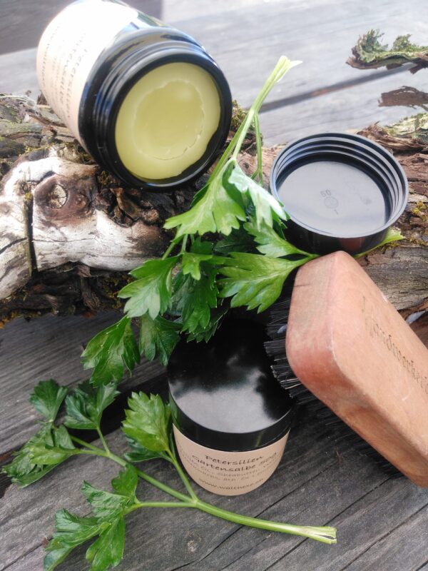 Jede Berührung mit dieser Petersiliensalbe ist wie ein Spaziergang durch einen duftenden Kräutergarten nach einem Sommerregen…erfrischend, belebend und voller Lebenskraft.